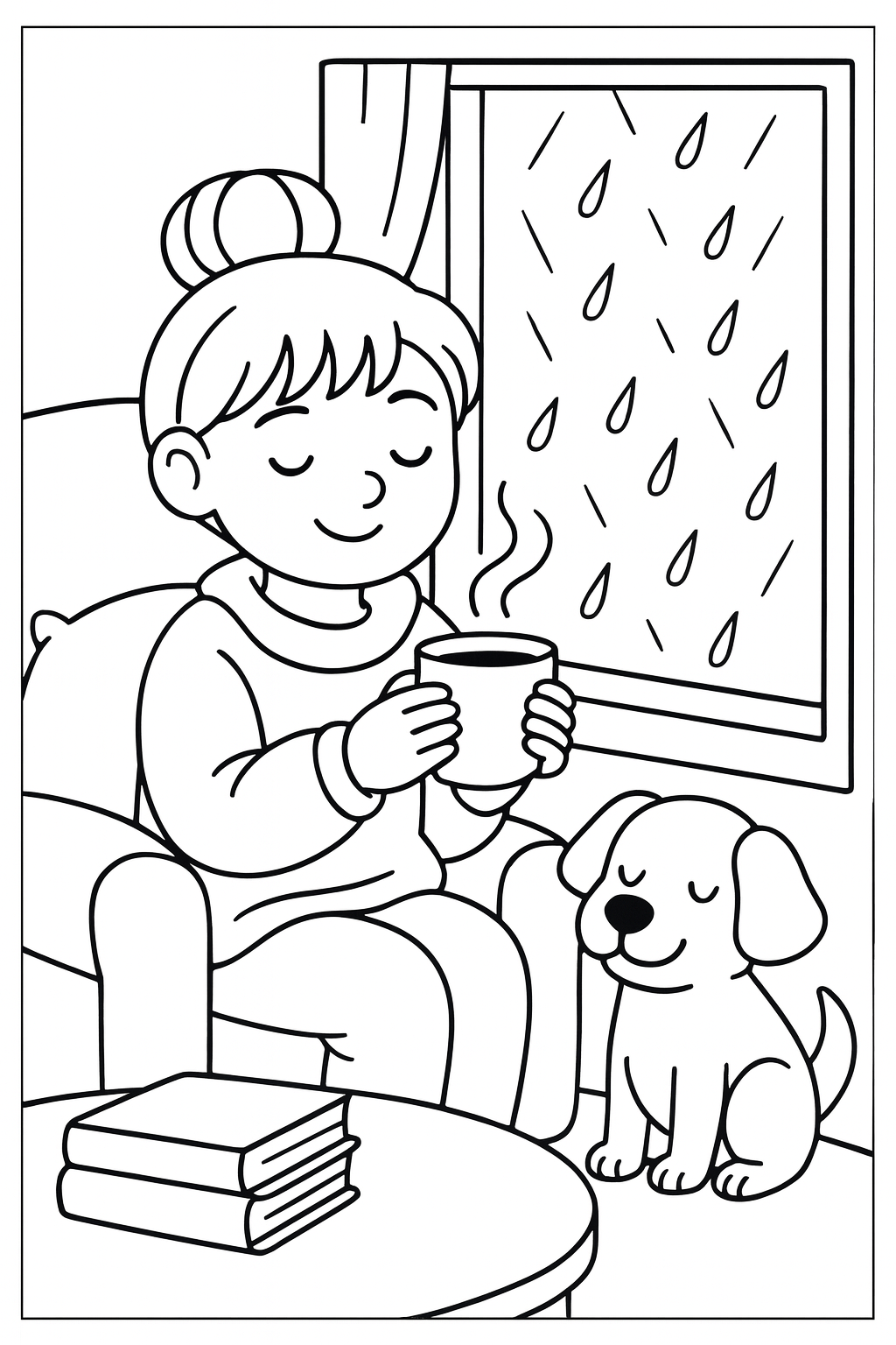 Free coloring page of a Lady Sipping Tea with rain falling outside
