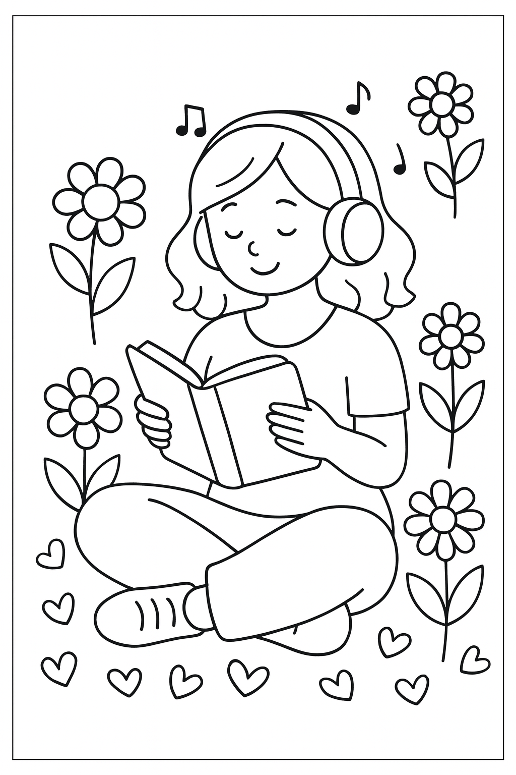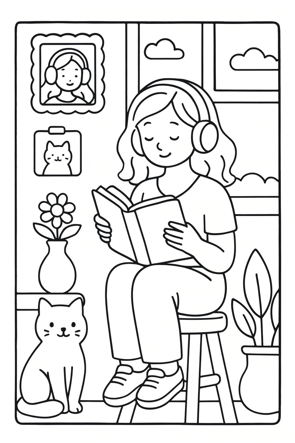 Free coloring page of a Lady chilling and listening to music
