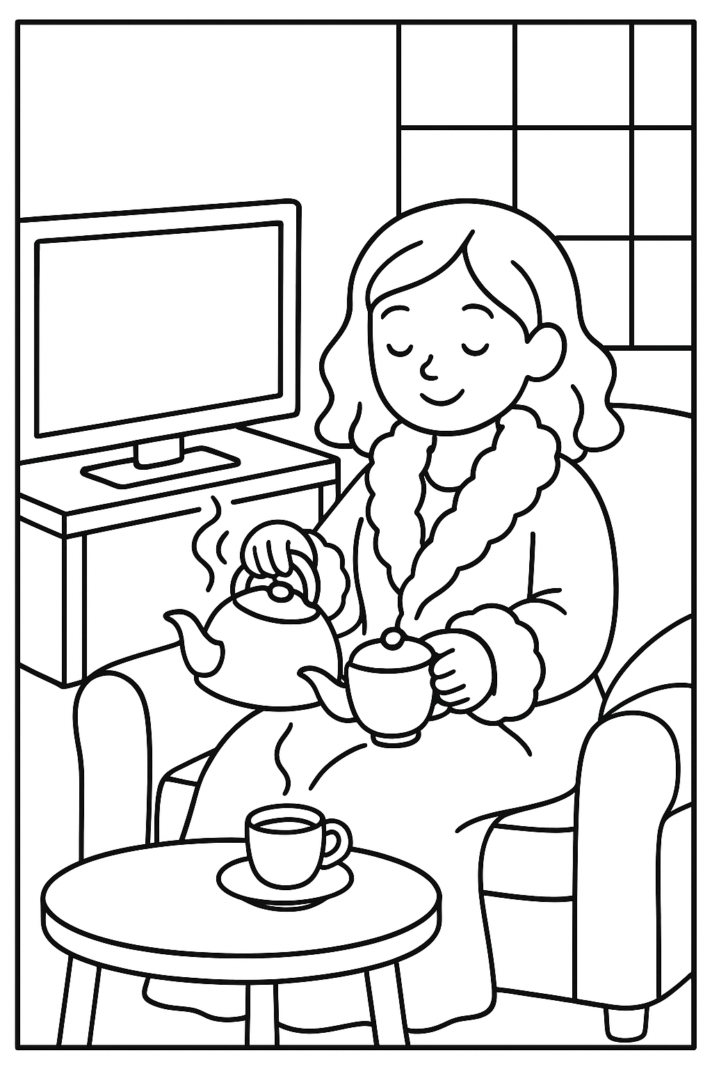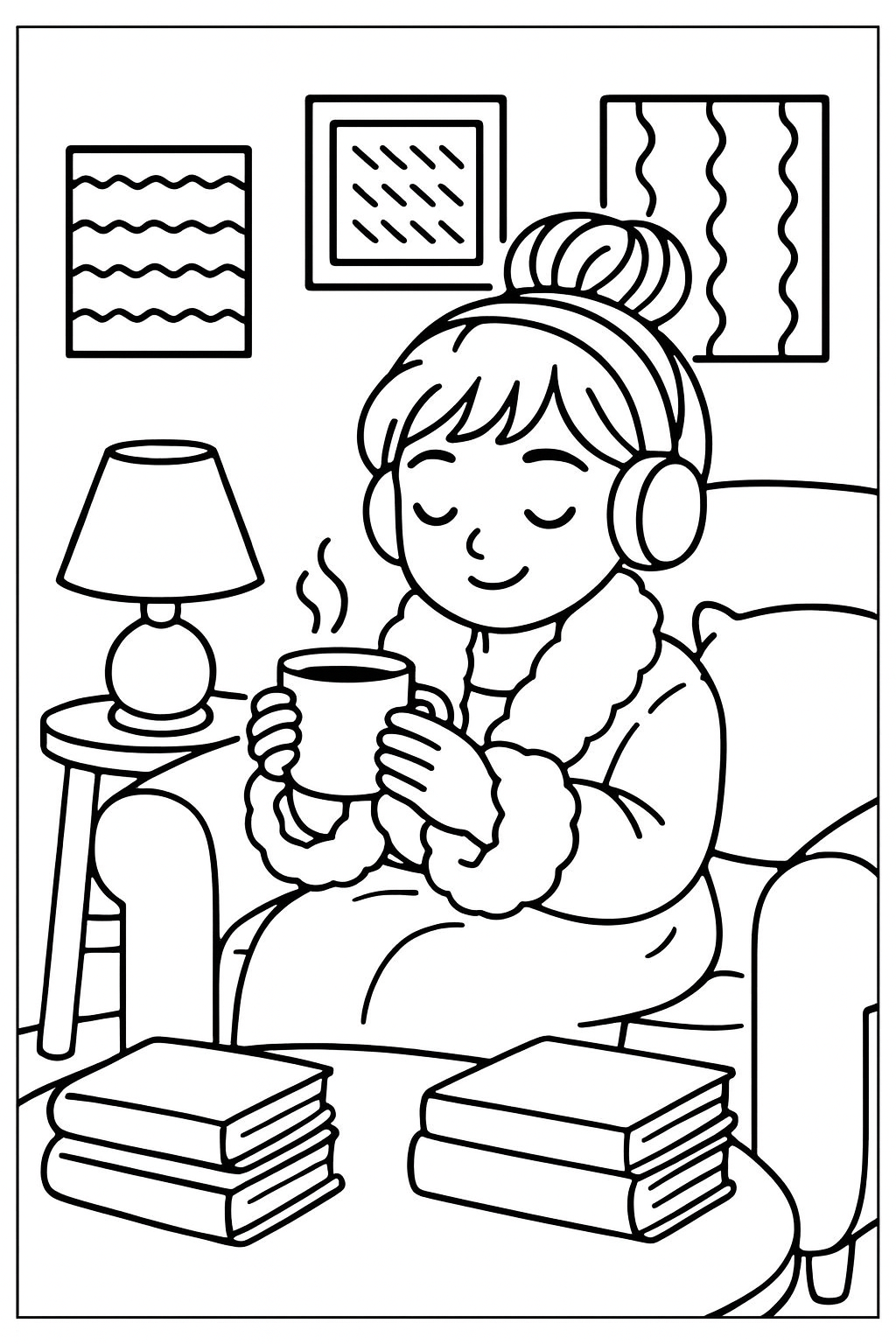 Think of relaxing images: a woman in a cup of tea, cozy living room with warm blankets and gentle lamps, or comfortable corners in which the ultimate coziness is sought. Such coloring pages are not just another creative exercise, but it is such a pleasant way to forget about the stresses of everyday life.