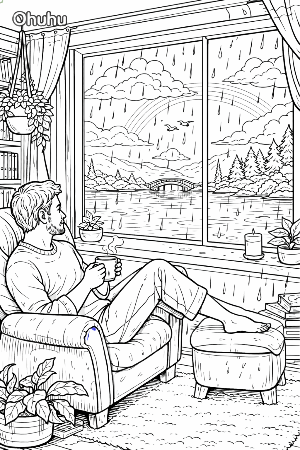 Amateurs like cozy rain coloring pages because their line work includes detailed designs. And offer the chance to explore shading and texture. The combination of the soft rain and other warm details, such as knitted sweaters, blankets, and hot drinks, promotes the utilisation of warm, friendly palettes.