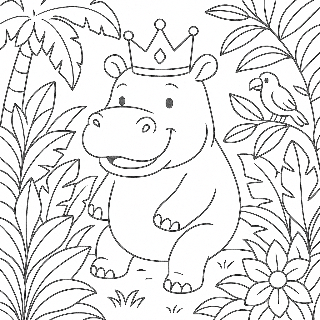 Free coloring page of a Hippo in the Jungle wearing a crown