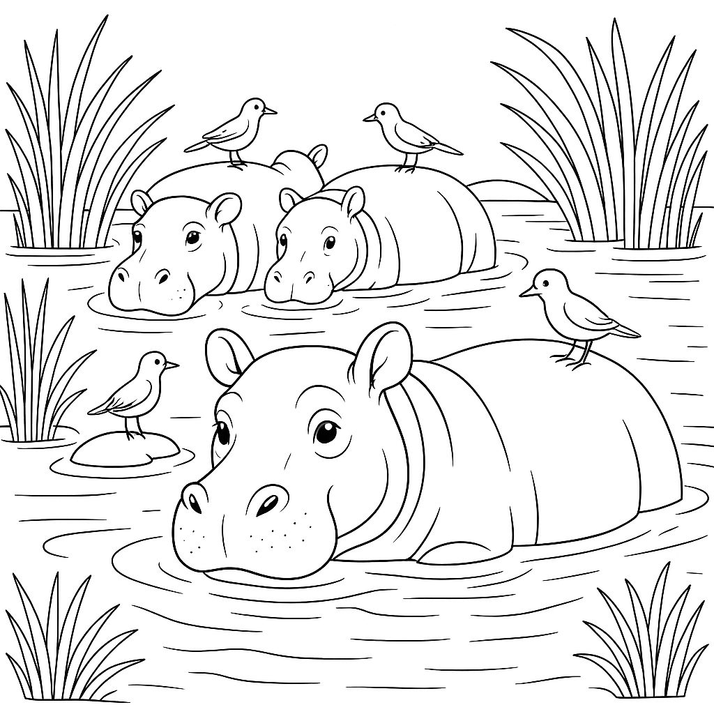 Free coloring page of a Hippopotamus in the River with Birds on their back