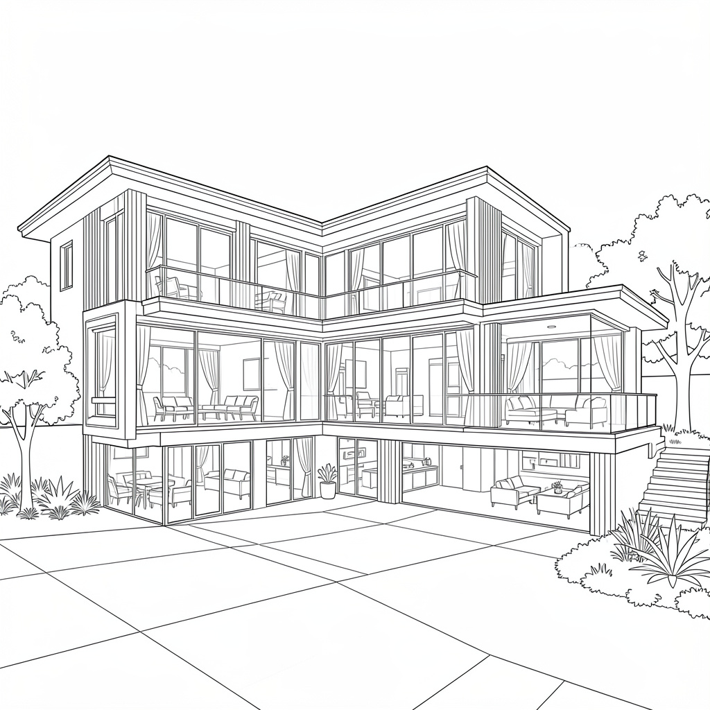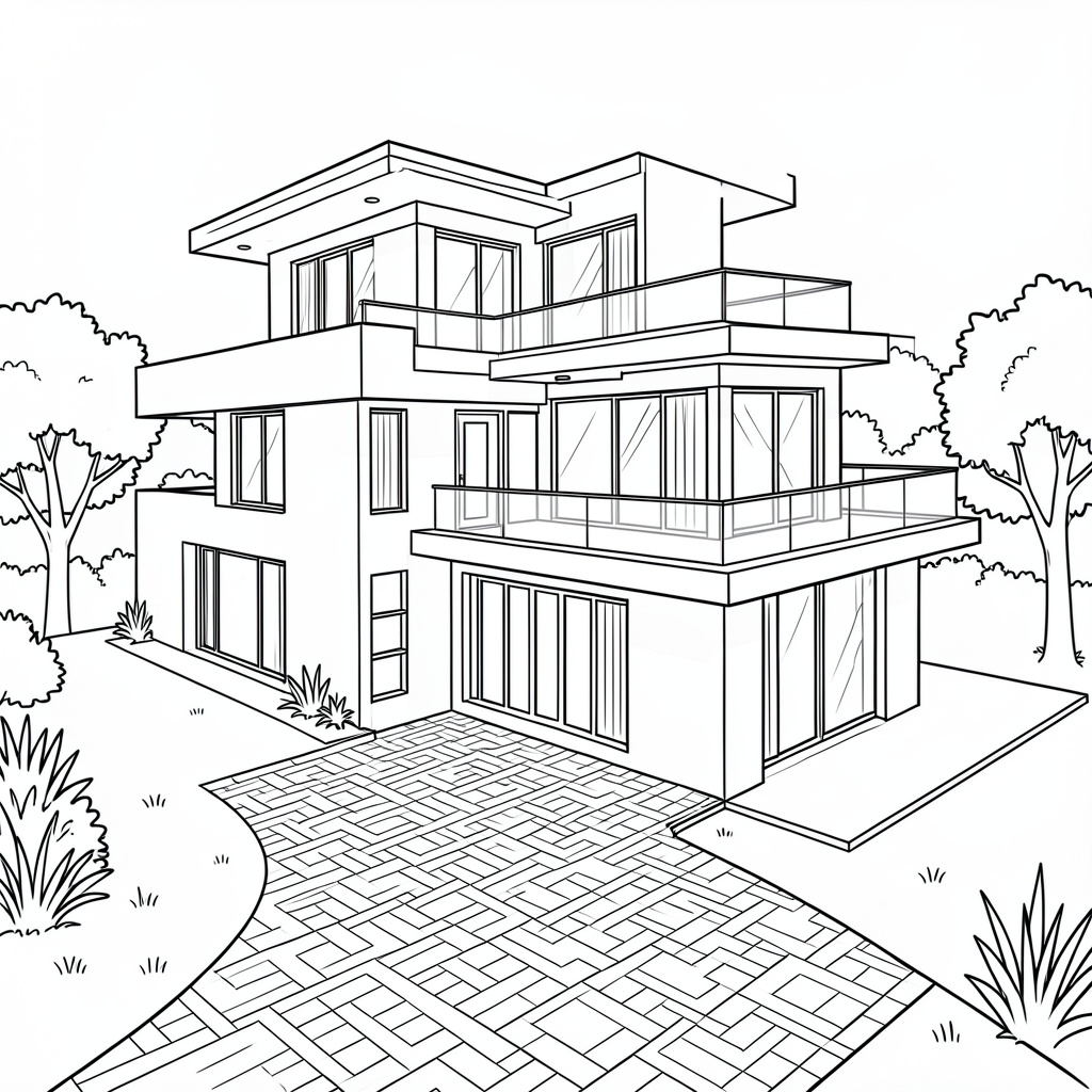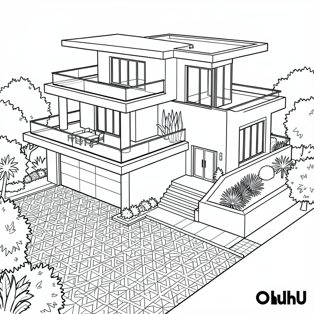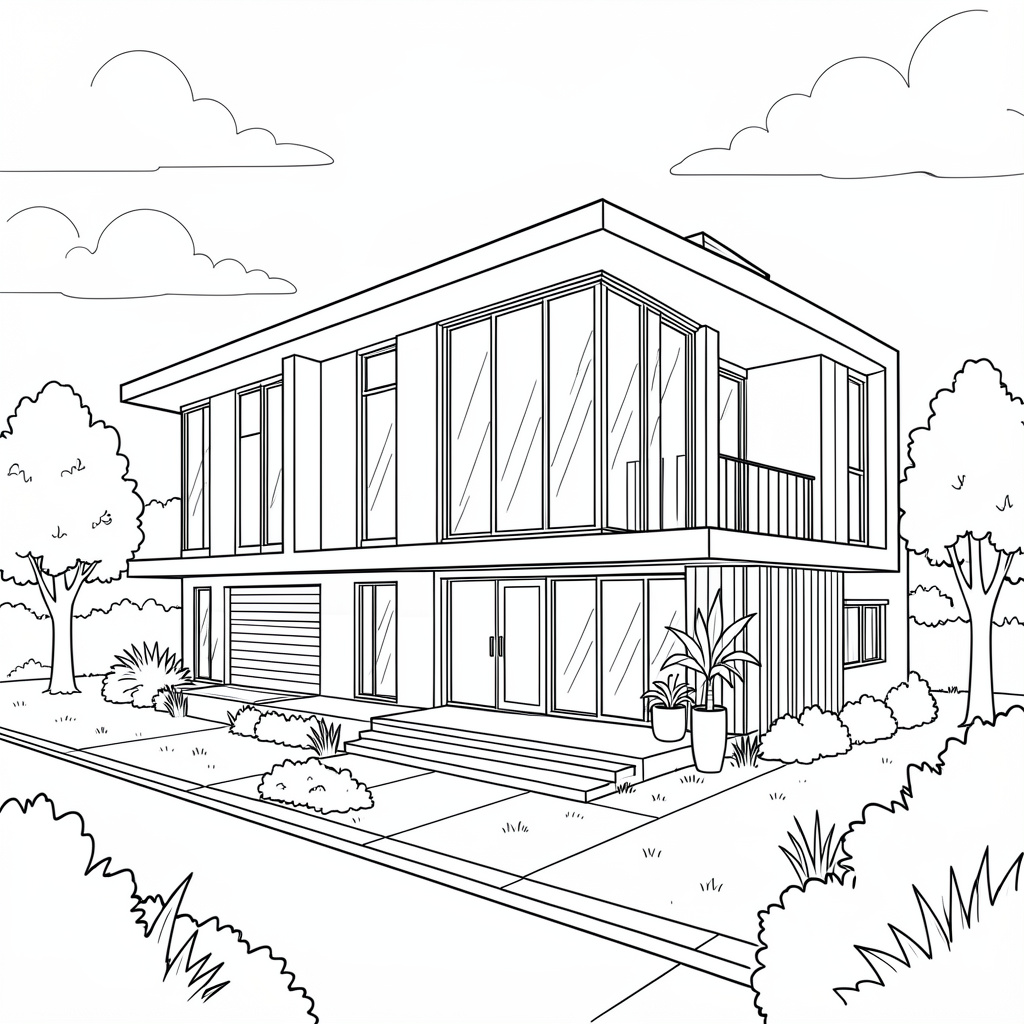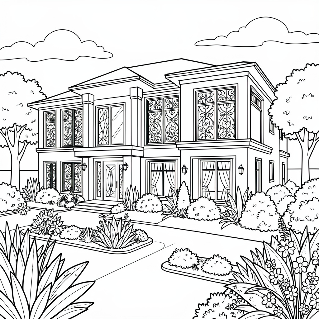 In reality, designers often color modern mansions using neutral or monochrome palettes. Coloring pages, however, give artists the freedom to explore bright and creative color schemes that would rarely appear in real-life construction.