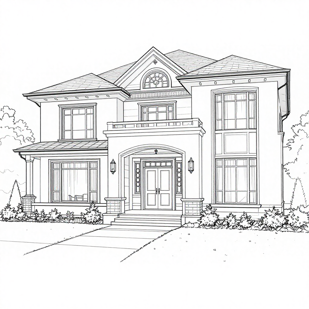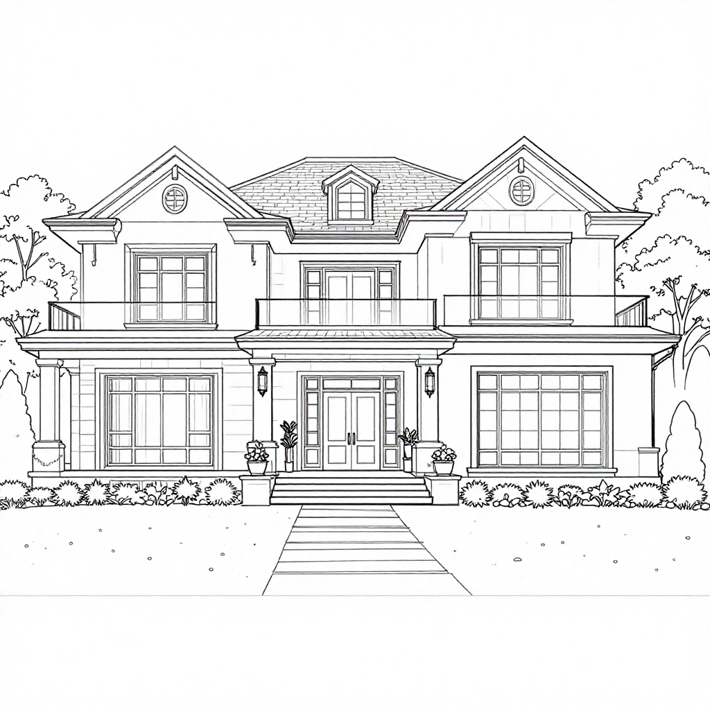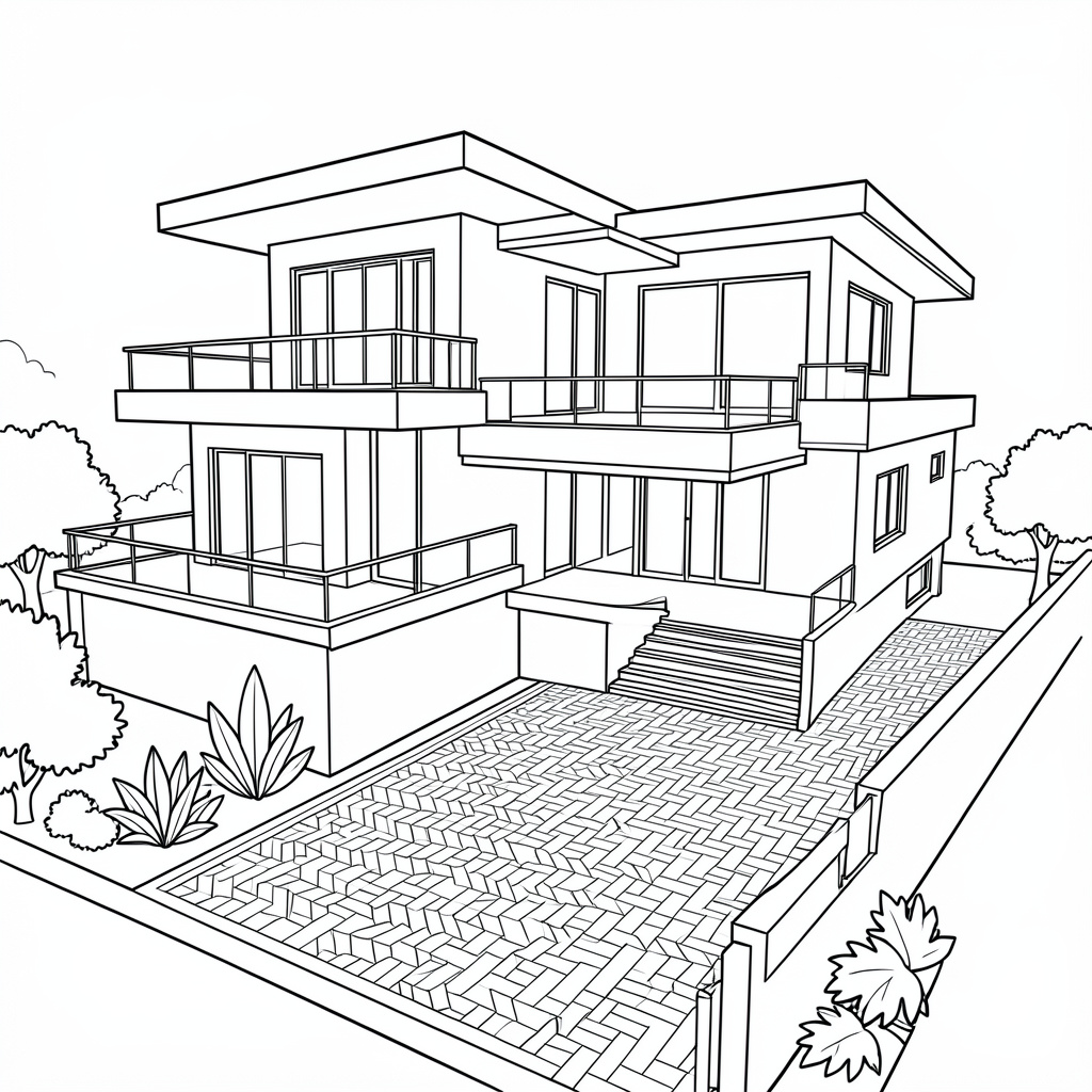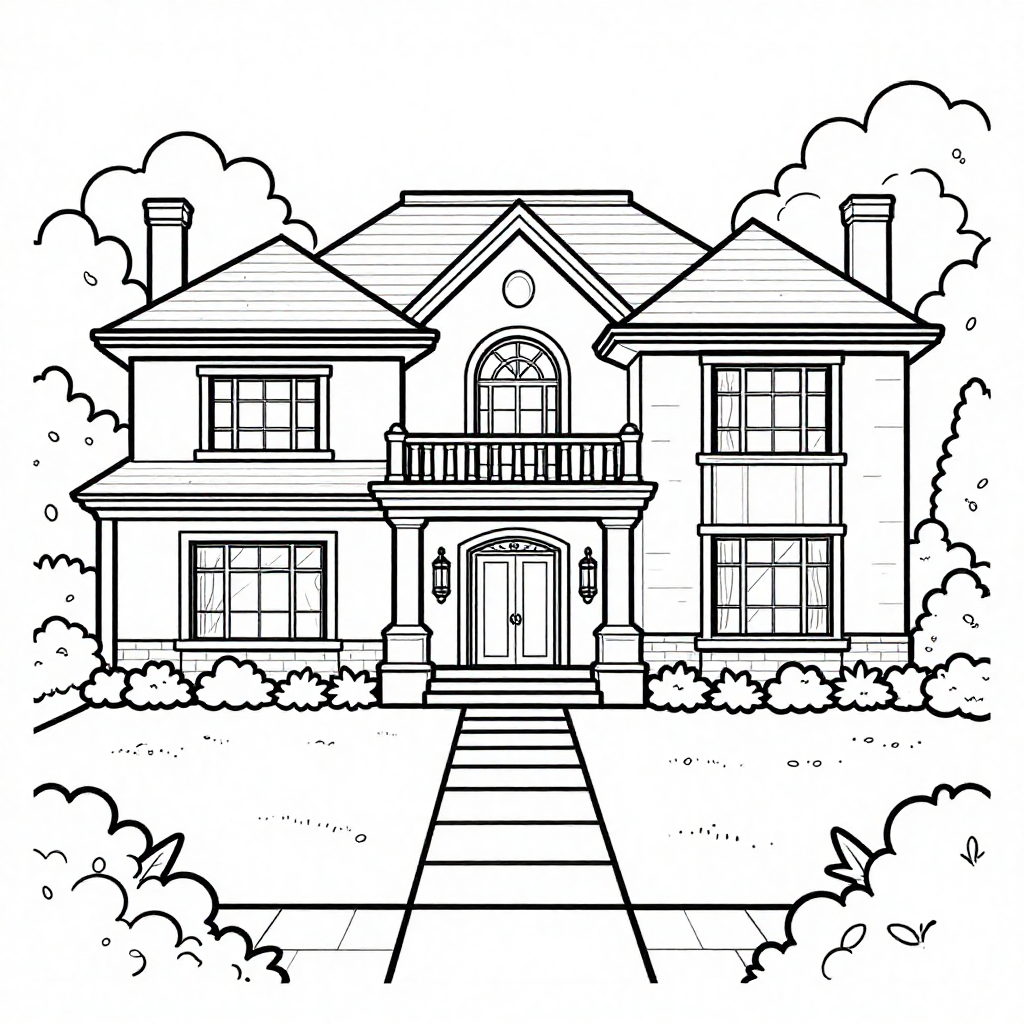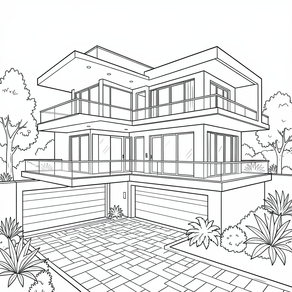 In reality, designers often color modern mansions using neutral or monochrome palettes. Coloring pages, however, give artists the freedom to explore bright and creative color schemes that would rarely appear in real-life construction.