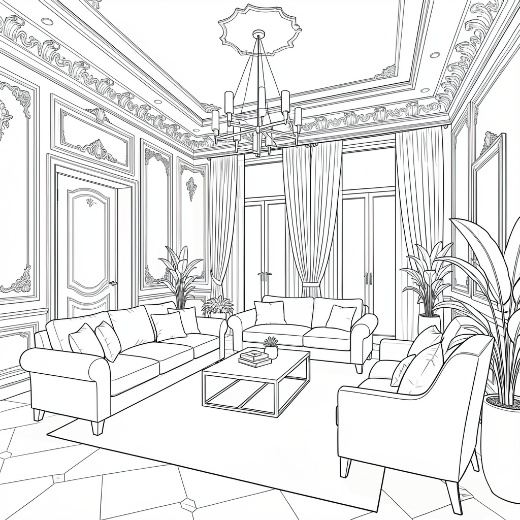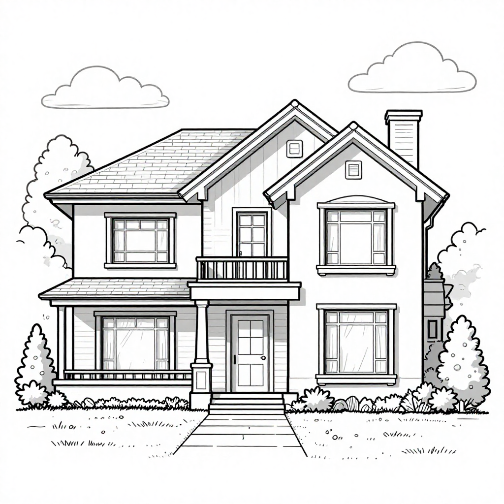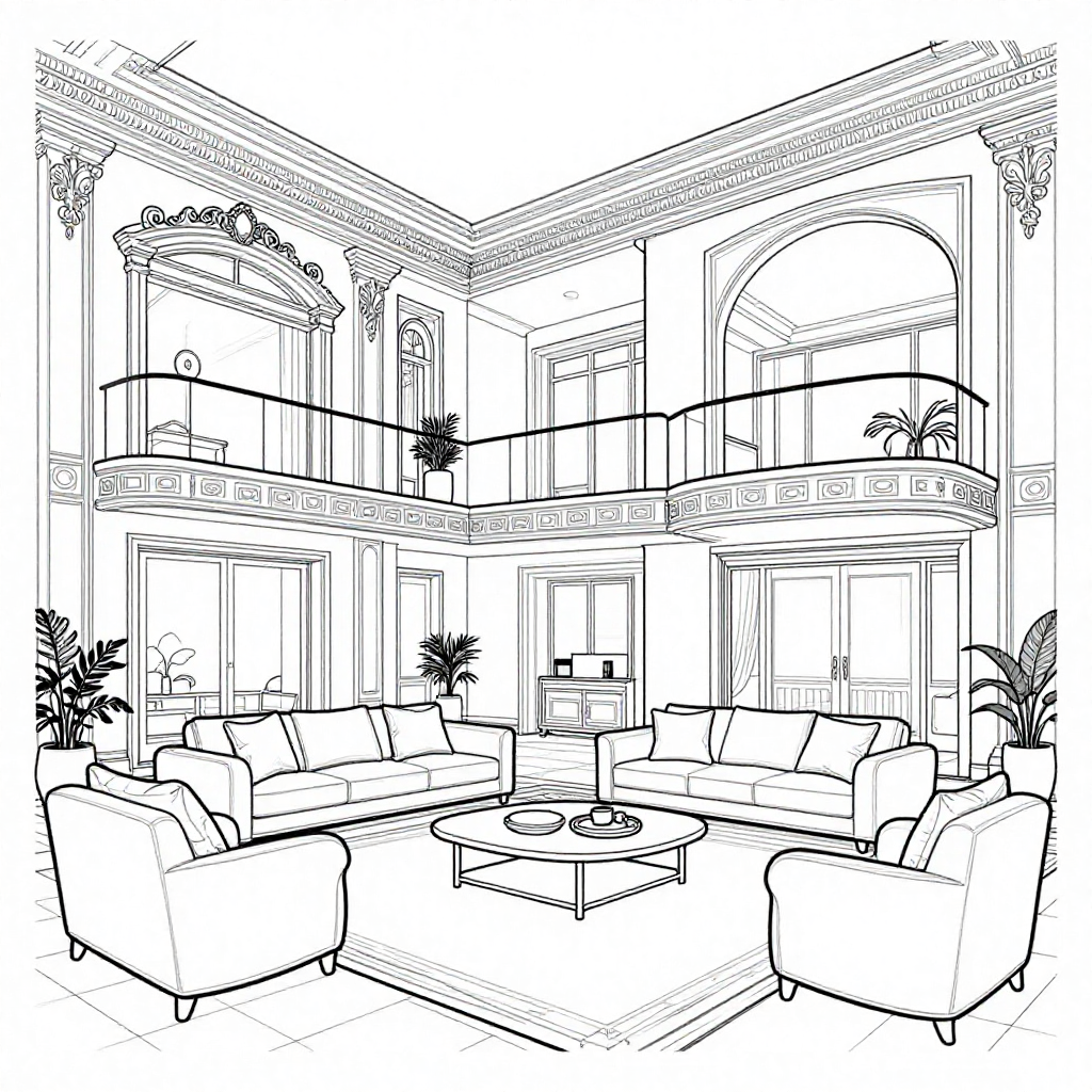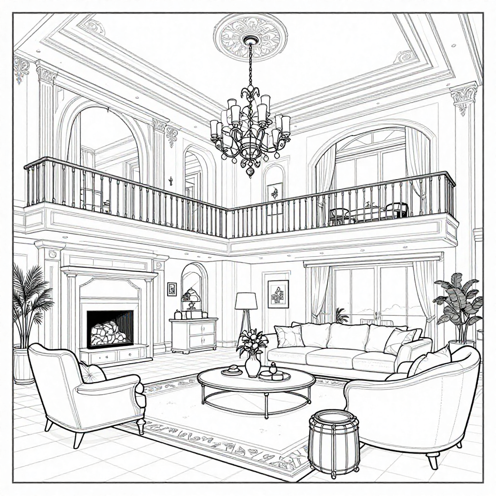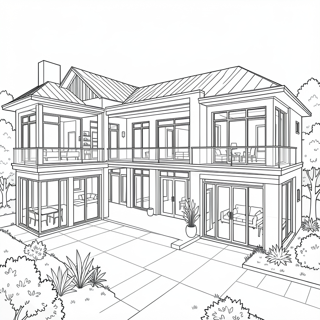 In reality, designers often color modern mansions using neutral or monochrome palettes. Coloring pages, however, give artists the freedom to explore bright and creative color schemes that would rarely appear in real-life construction.